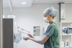 Female nurse in surgical mask and cap using hand sanitizer in operation room