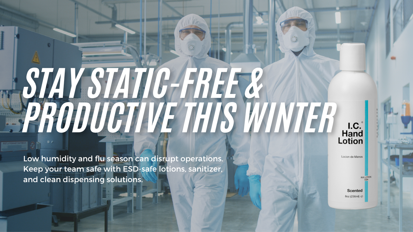 Winter can be tough on both people and processes inside controlled environments. When humidity drops, static builds up faster and hands dry out under gloves. R&R Lotion’s Winter Cleanroom Collection keeps your facility compliant, comfortable, and running efficiently. Each product is formulated to prevent ESD events, protect skin from irritation, and ensure your team maintains focus and safety through the cold season.